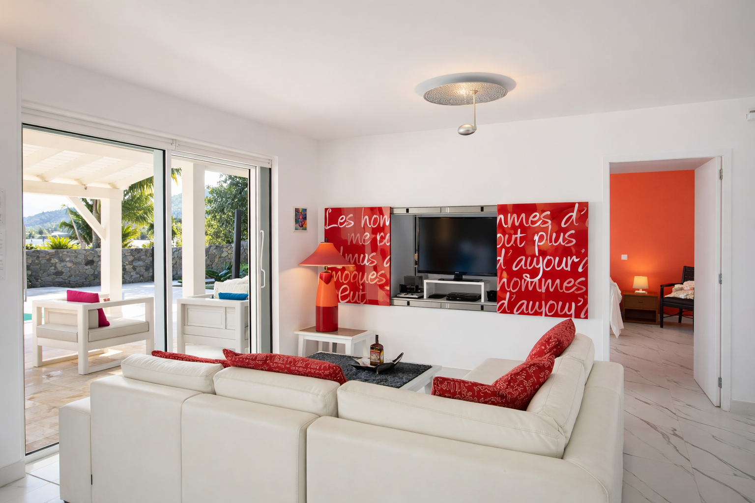 La villa se compose de quatre chambres, chacune avec sa salle de douche privative, garantissant confort et intimité à tous les voyageurs. La grande pièce de vie, lumineuse et ouverte, s’étend naturellement vers de vastes terrasses offrant une vue imprenable sur la baie et son lagon, idéale pour partager des repas, admirer les levers de soleil ou simplement profiter de la douceur des alizés.