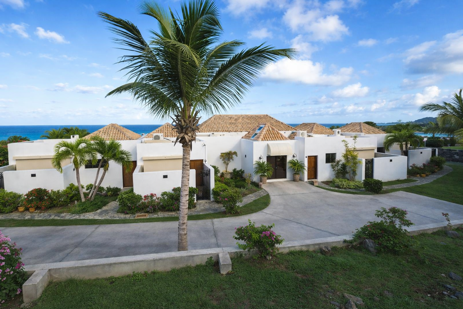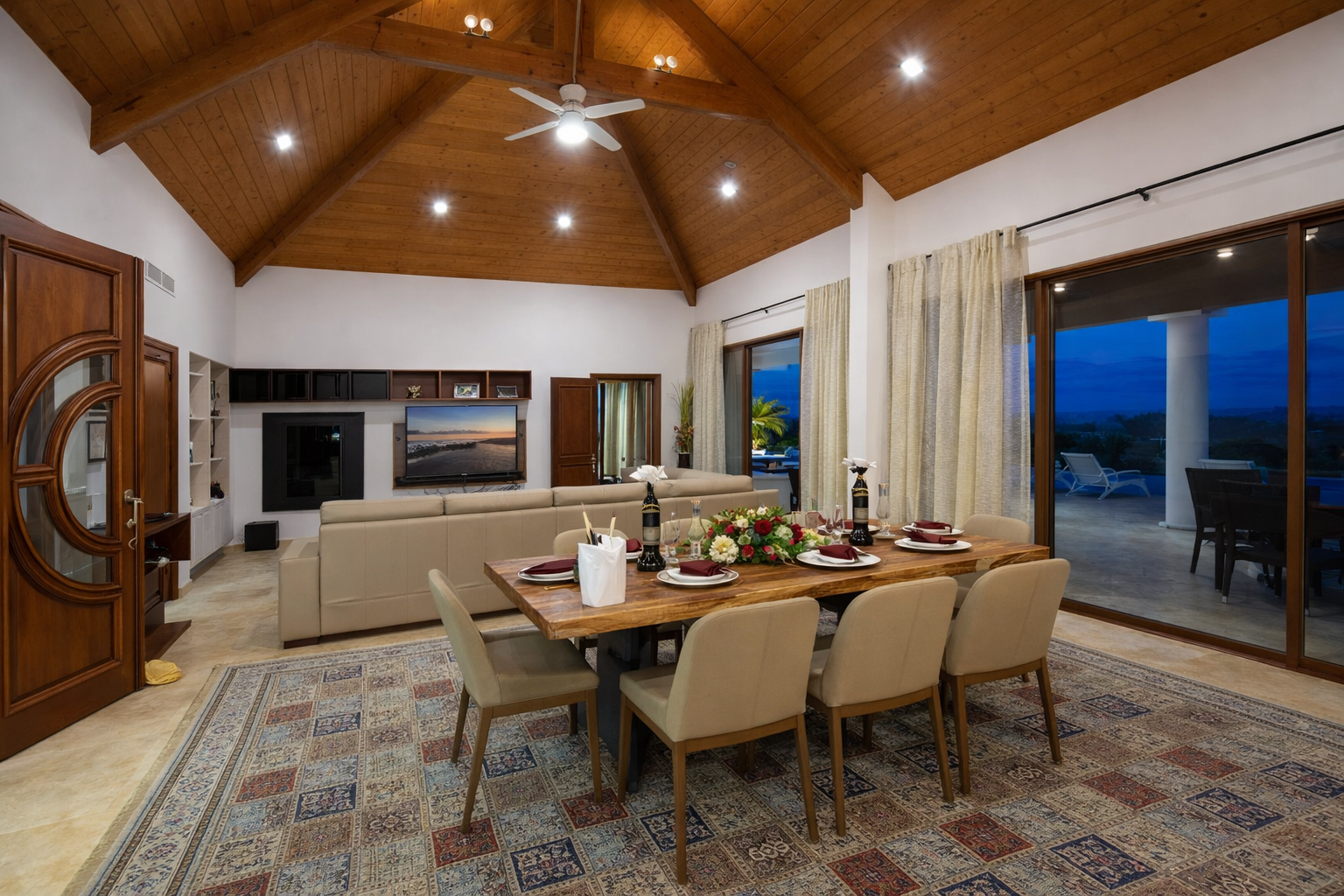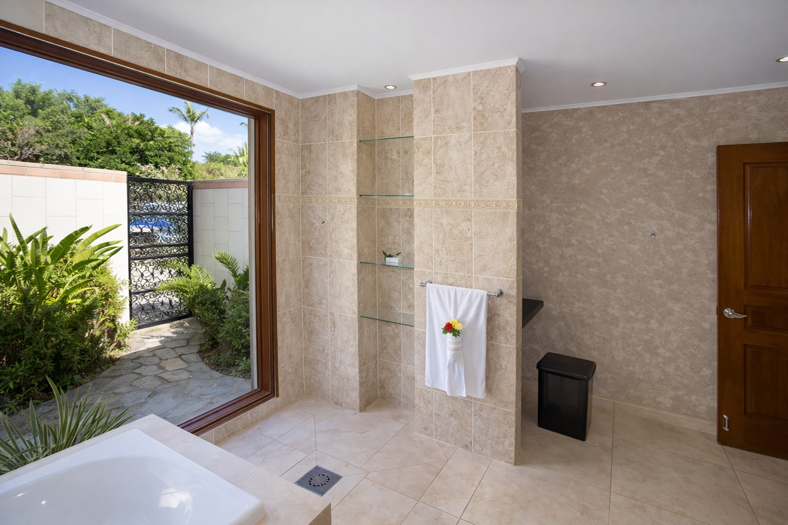 Dès votre arrivée, un jardin tropical borde l’allée privée menant à la villa. Véritable cocon de verdure, il enveloppe l’ensemble de la propriété et renforce le sentiment d’isolement et de sérénité. L’entrée se fait par de majestueuses portes en fer forgé, ouvrant sur un atrium éclairé par le ciel. Cet espace donne immédiatement le ton : volumes généreux, lignes élégantes et une architecture pensée pour sublimer la vue.