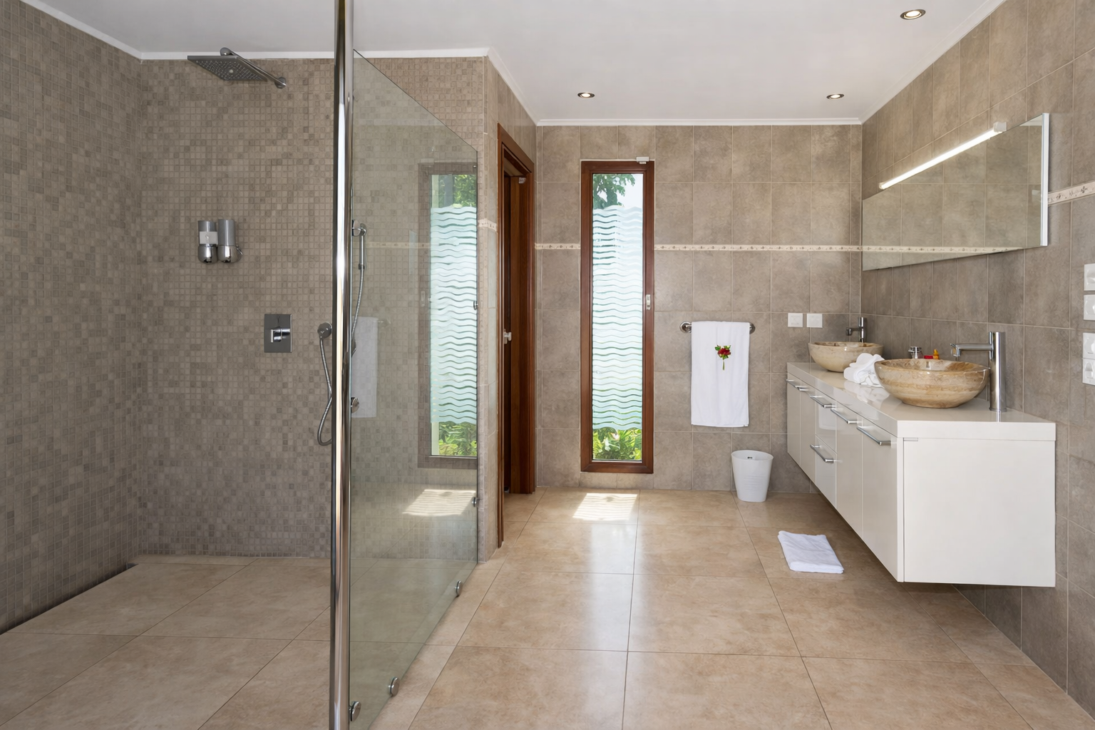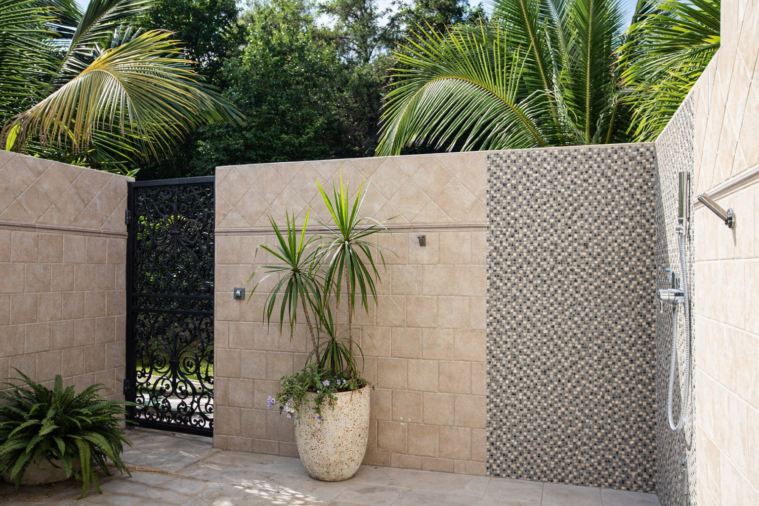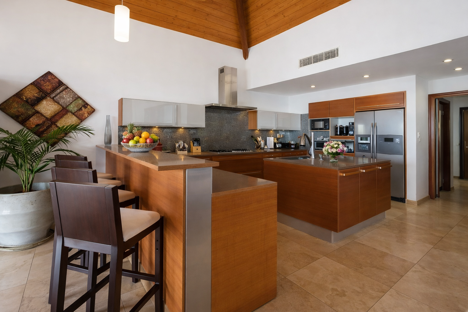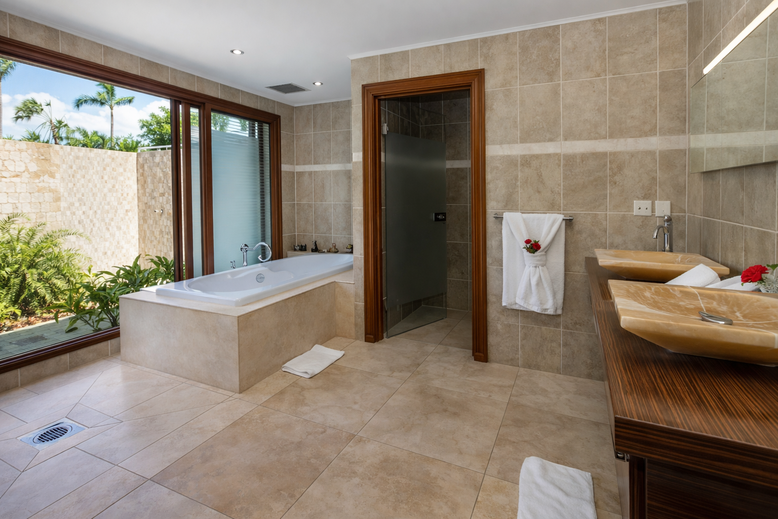 Dès votre arrivée, un jardin tropical borde l’allée privée menant à la villa. Véritable cocon de verdure, il enveloppe l’ensemble de la propriété et renforce le sentiment d’isolement et de sérénité. L’entrée se fait par de majestueuses portes en fer forgé, ouvrant sur un atrium éclairé par le ciel. Cet espace donne immédiatement le ton : volumes généreux, lignes élégantes et une architecture pensée pour sublimer la vue.